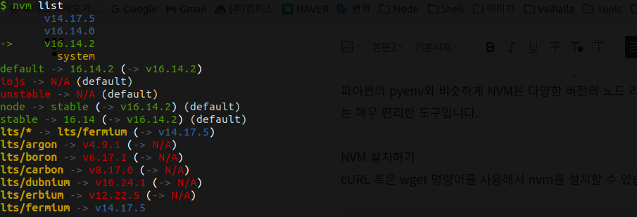 아래 명령어로 현재 설치된 노드의 버전들의 목록을 확인해 볼 수 있습니다.