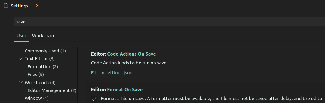 <Ctrl+,> 단축키로 설정 창으로 이동 후 아래 처럼 설정합니다.