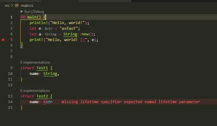 Error Lens를 사용할 때 강조 표시되는 유형을 보여주기 위해 VS Code의 코드 스니펫의 다음 이미지를 보면 구조체를 정의할 때 &를 사용할 수 없기 때문에 14행에 오류가 있음을 확인할 수 있습니다.