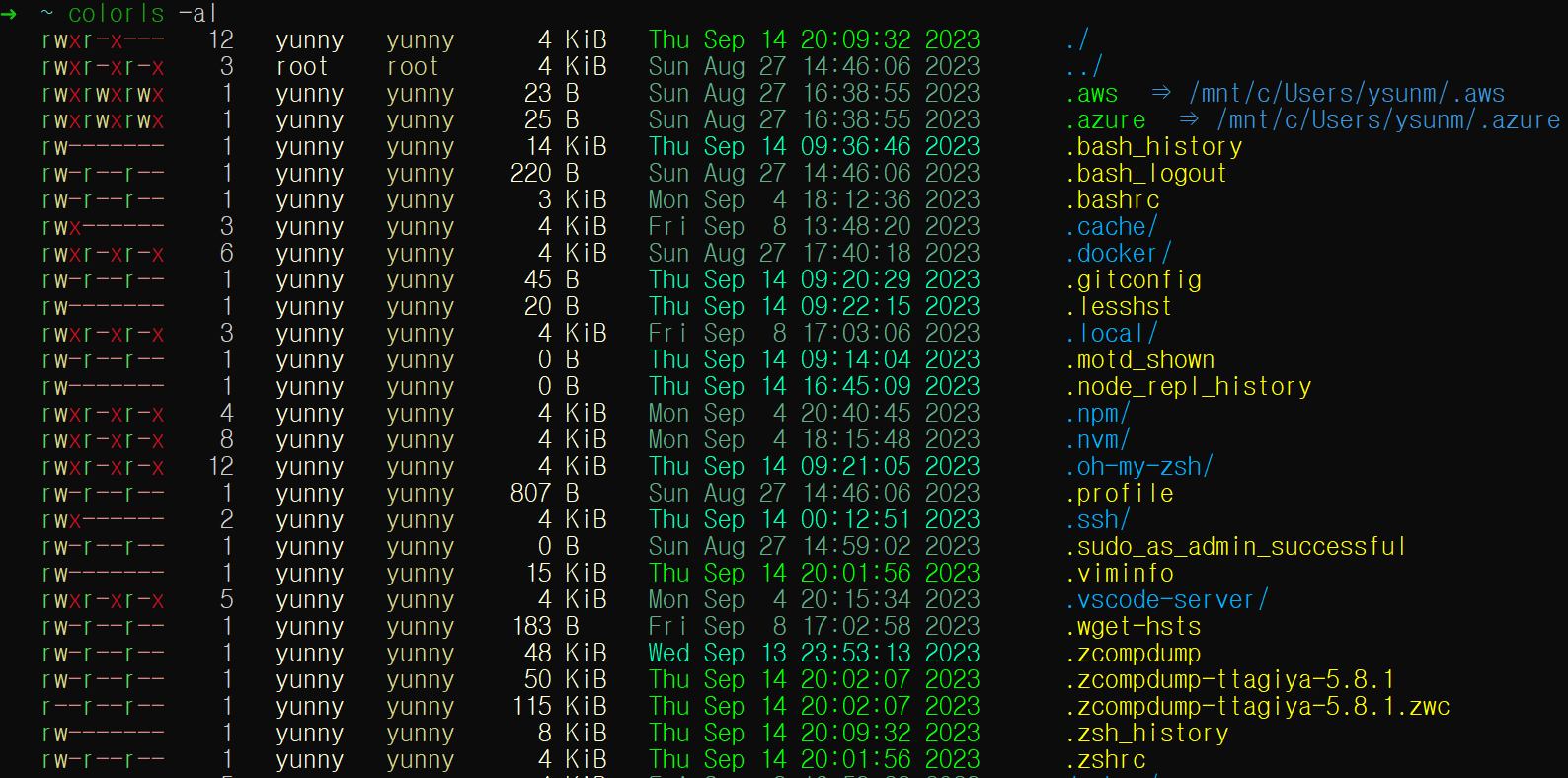 WSL2에서 터미널을 실행하면 아래 이미지처럼 디렉토리와 파일 리스트가 별로 안예쁩니다. 이걸 좀 예쁘게 해 보겠습니다.